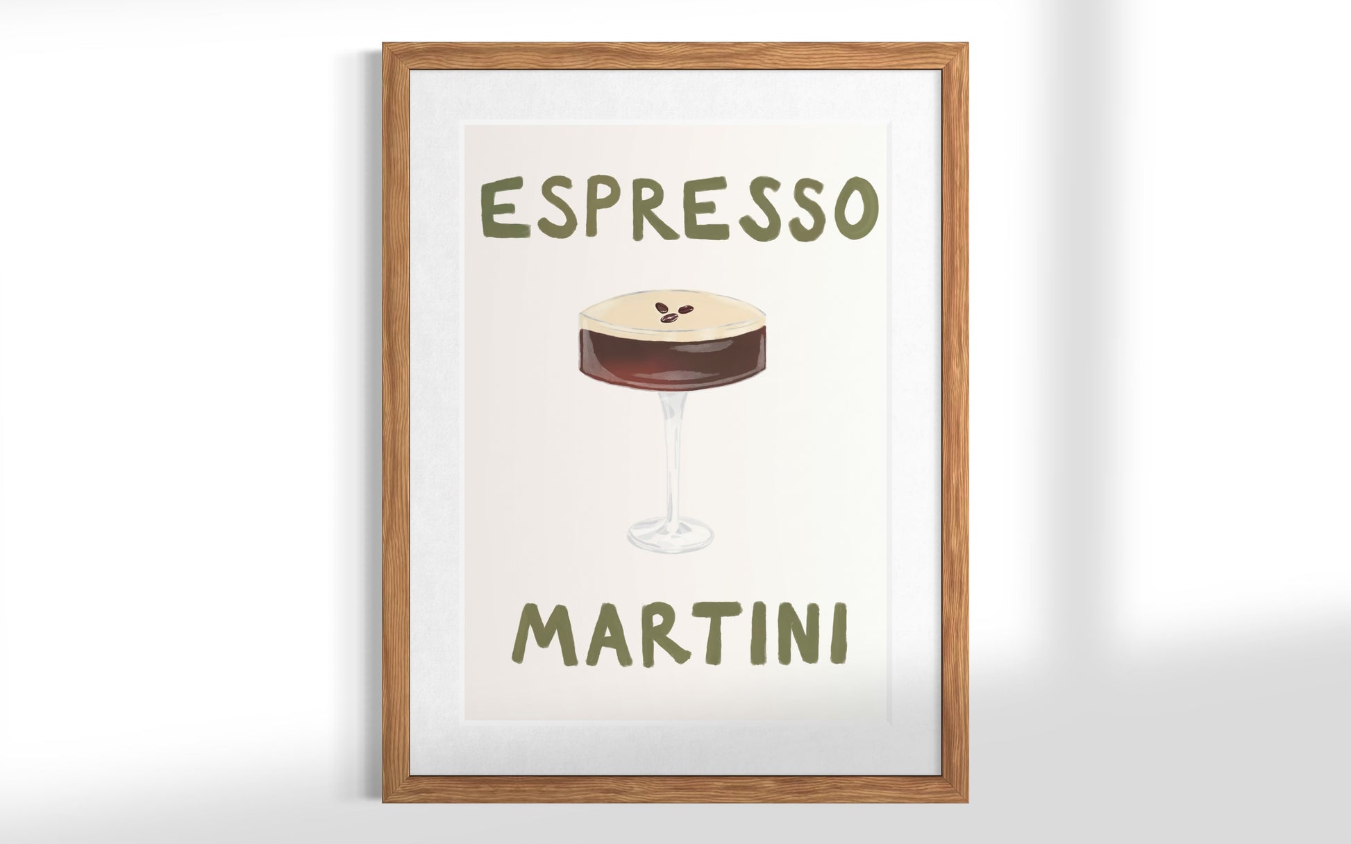 Brighten up your kitchen with this quirky espresso martini print! This fun design is perfect for coffee and cocktail lovers, making every coffee break or evening sip a little more special